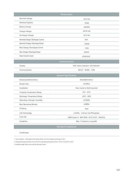 The Ecco ELV24100 is a 25.6V 100Ah lithium iron phosphate (LiFePO₄) battery designed for home and small commercial backup power applications. Delivering a total energy capacity of 2.56kWh, this wall-mounted unit is an excellent choice for modular or low-voltage storage systems paired with compatible hybrid inverters.