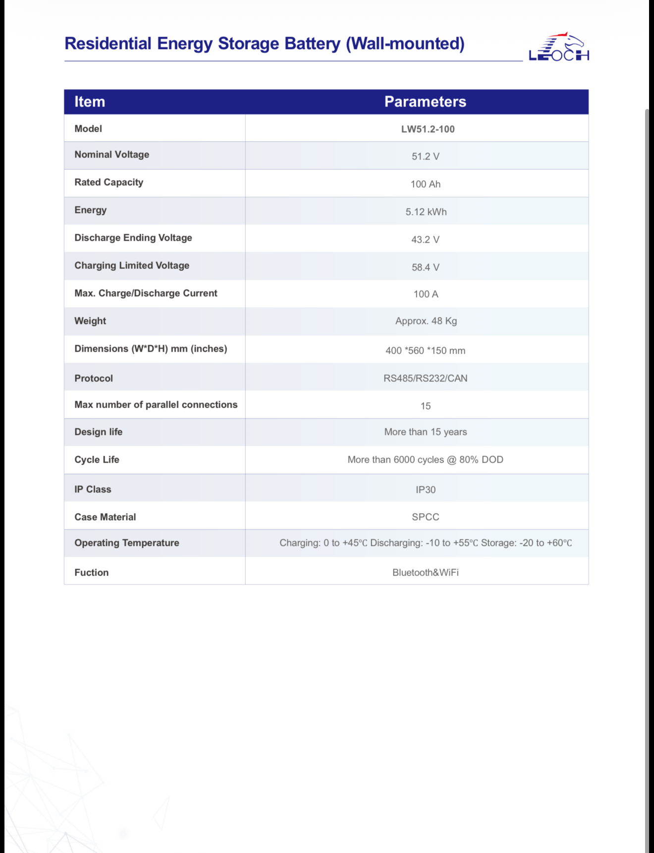 The Leoch LW51.2-100 is a wall-mounted residential energy storage battery built for dependable backup and daily cycling in hybrid and off-grid systems. With 5.12kWh of usable energy storage at 51.2V, it supports parallel expansion, multiple communication protocols, and app-based monitoring via Bluetooth and WiFi.